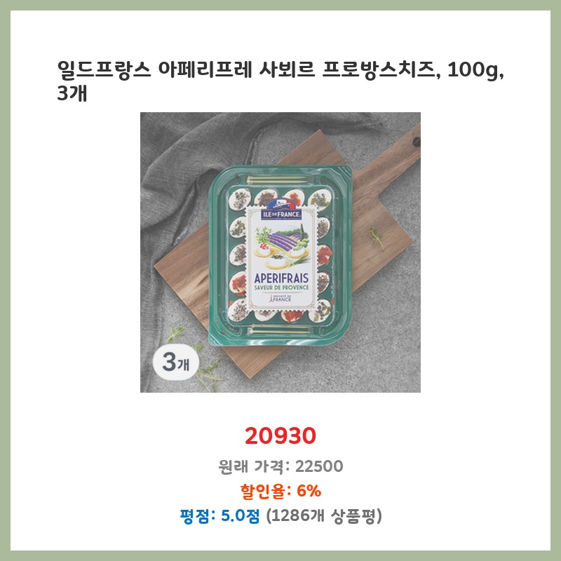 프랑스산 고급 치즈를 집에서 편하게 즐기고 싶어서 구매했습니다. 4개입이라 여러 번 나눠 먹을 수 있고, 100g씩 소포장되어 신선하게 보관할 수 있다는 점이 좋았습니다. 아페리프레 사뵈르 프로방스 치즈의 풍미가 궁금했습니다.