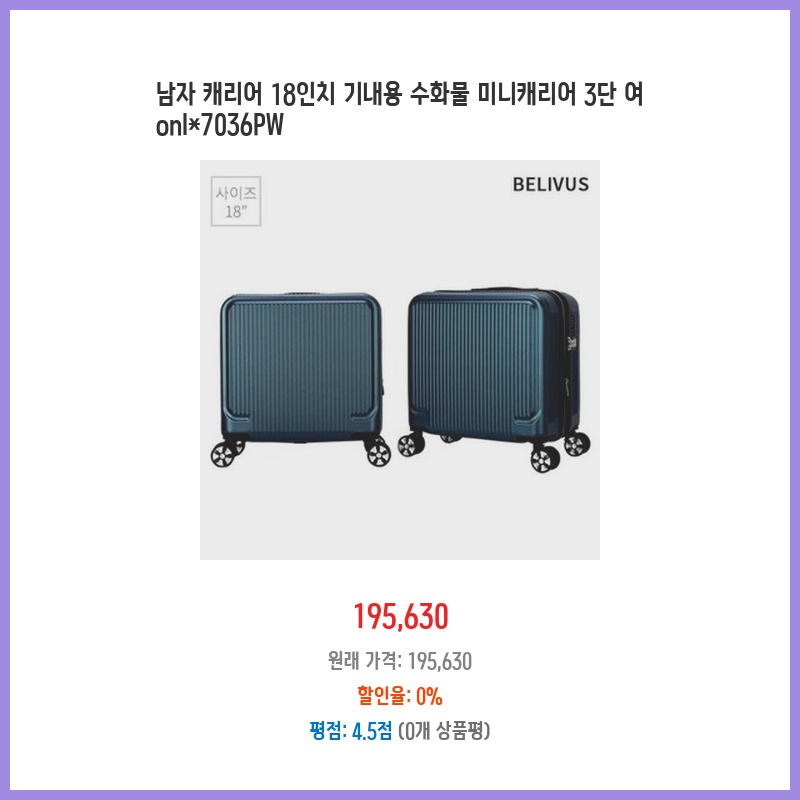 가볍고 튼튼한 소재에 18인치 기내용 사이즈라 휴대가 간편해 보여 구매했습니다. 깔끔한 디자인도 마음에 들었고, 바퀴도 부드럽게 잘 굴러갈 것 같아 기대됩니다. 합리적인 가격도 매력적이었습니다.