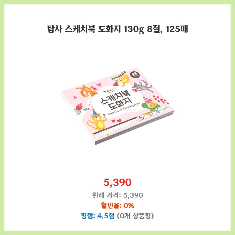 130g의 두꺼운 도화지라 펜 사용 시 종이가 울거나 뒤에 비치는 현상이 적어 만족스럽습니다. 8절 사이즈에 125매나 들어있어 오랫동안 사용할 수 있고, 가격 대비 용량이 훌륭합니다. 스케치 연습용으로 충분합니다.