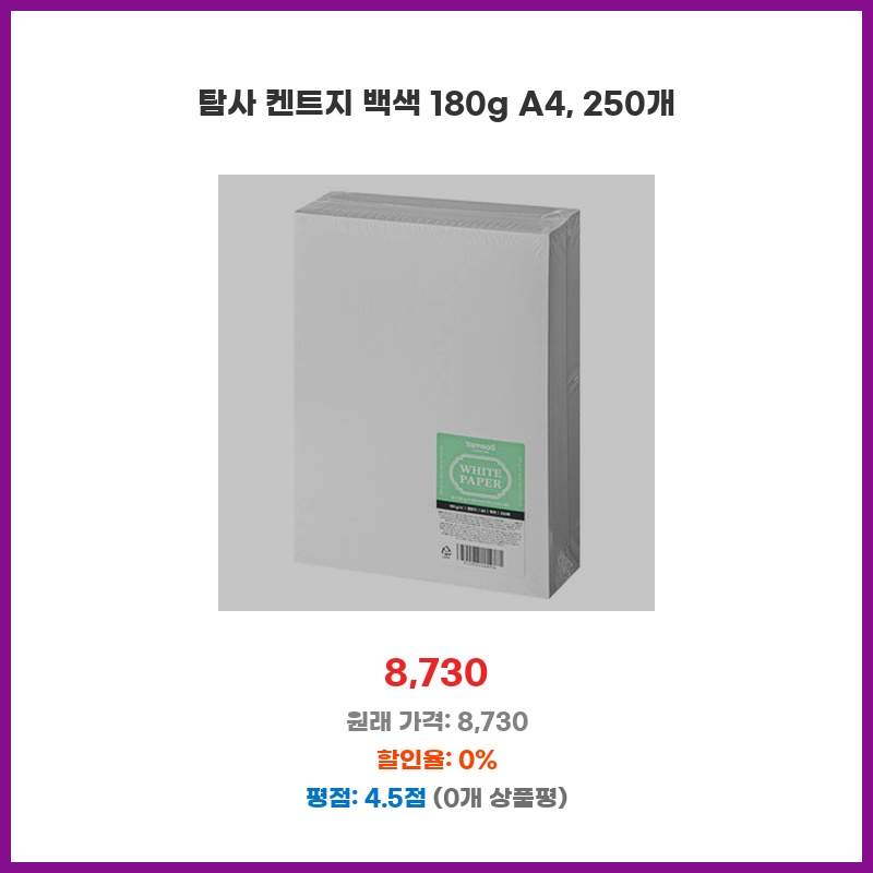180g 두께의 켄트지는 그림이나 디자인 작업에 적합해 잉크 번짐 없이 깔끔하게 작업할 수 있어서 구매했습니다. A4 사이즈에 250매라 양도 넉넉하고, 백색이라 어떤 작업에도 무난하게 사용 가능합니다. 가격 대비 용량이 만족스럽습니다.