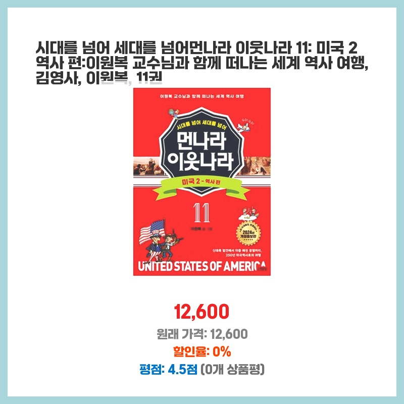 초등학생 자녀의 미국 역사 공부를 위해 구매했습니다. 이원복 교수님의 만화라 재미있게 학습할 수 있고, 세계 역사 흐름을 이해하는 데 도움이 될 것 같아 선택했습니다. 11권이라 내용도 충실할 것으로 예상됩니다.