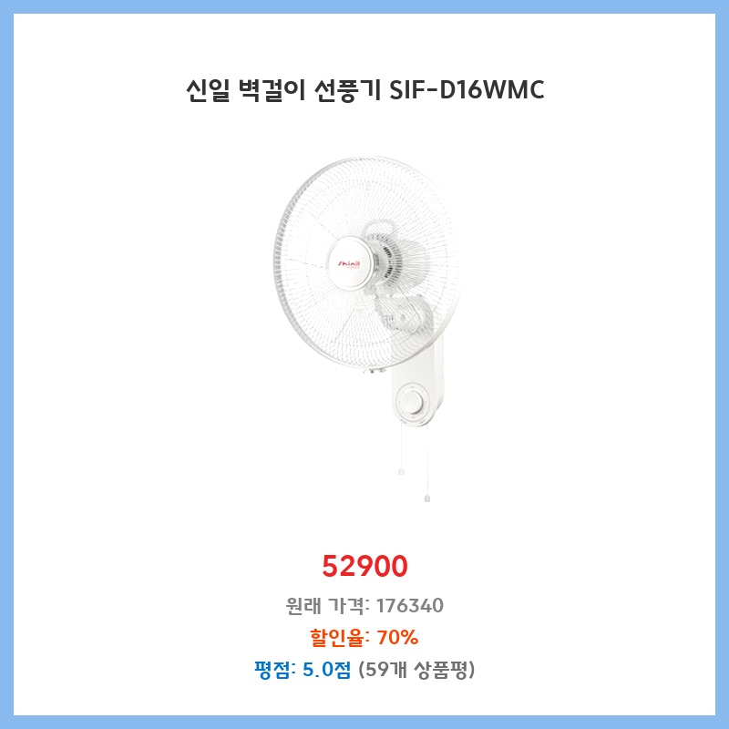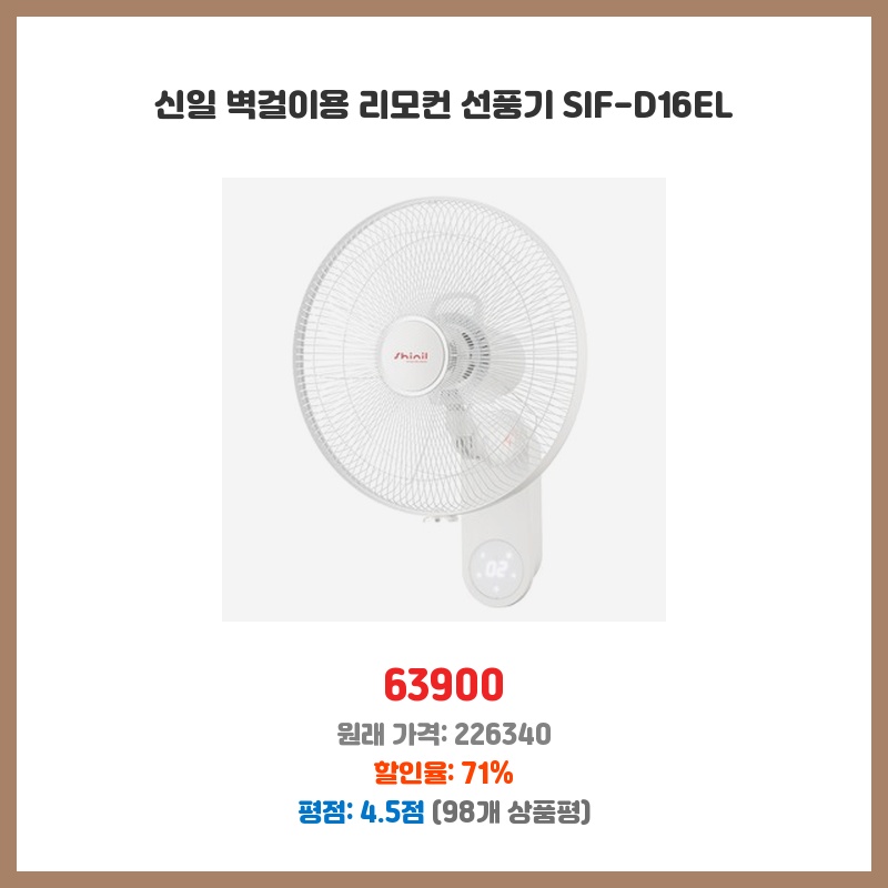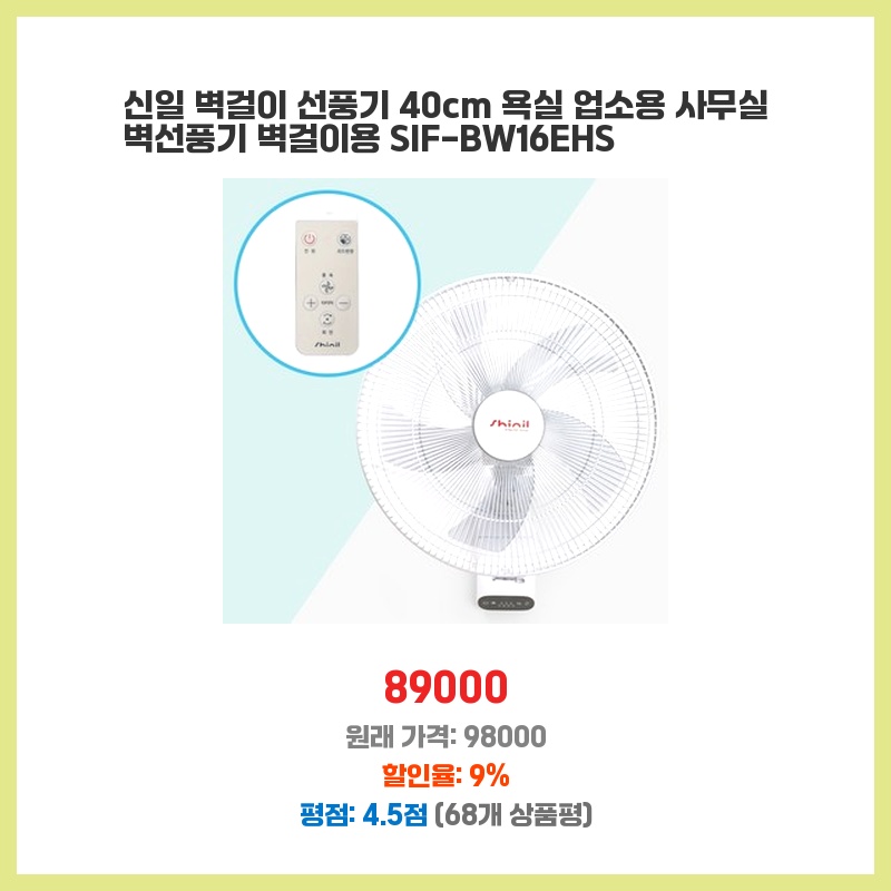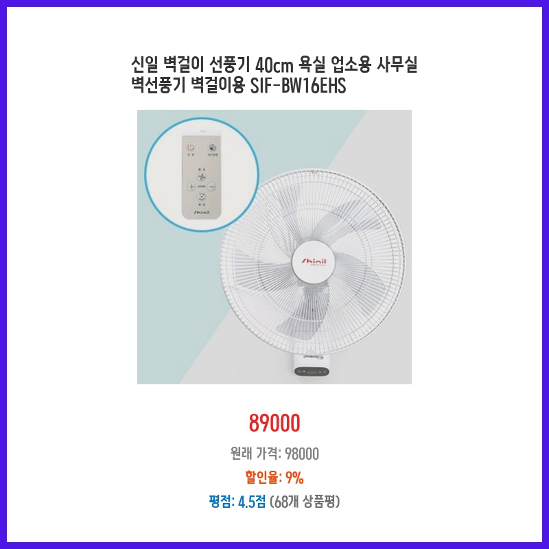 벽걸이형이라 공간 효율적이고, 리모컨으로 편리하게 조작 가능해서 구매했습니다. 신일 제품이라 믿을 수 있었고, 가격 대비 성능도 괜찮아 보였습니다. 바람 세기도 적절하고 소음도 크지 않아 만족합니다.