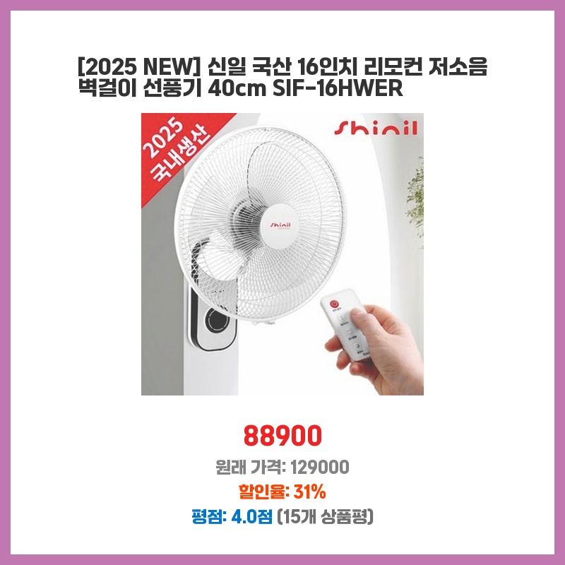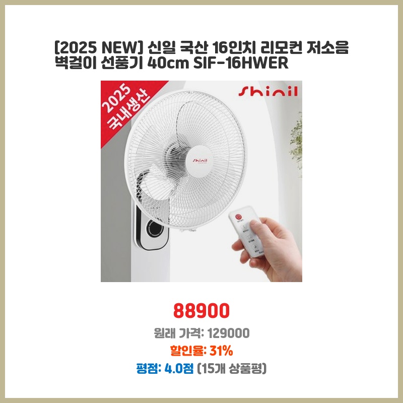 [2025 NEW] 신일 국산 16인치 리모컨 저소음 벽걸이 선풍기 40cm SIF-16HWER