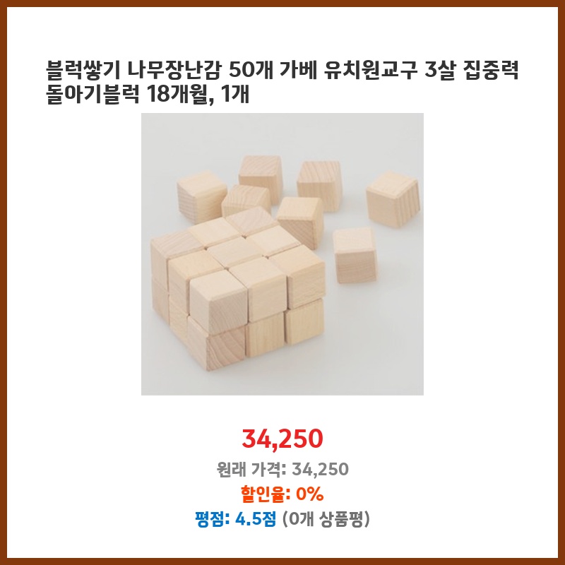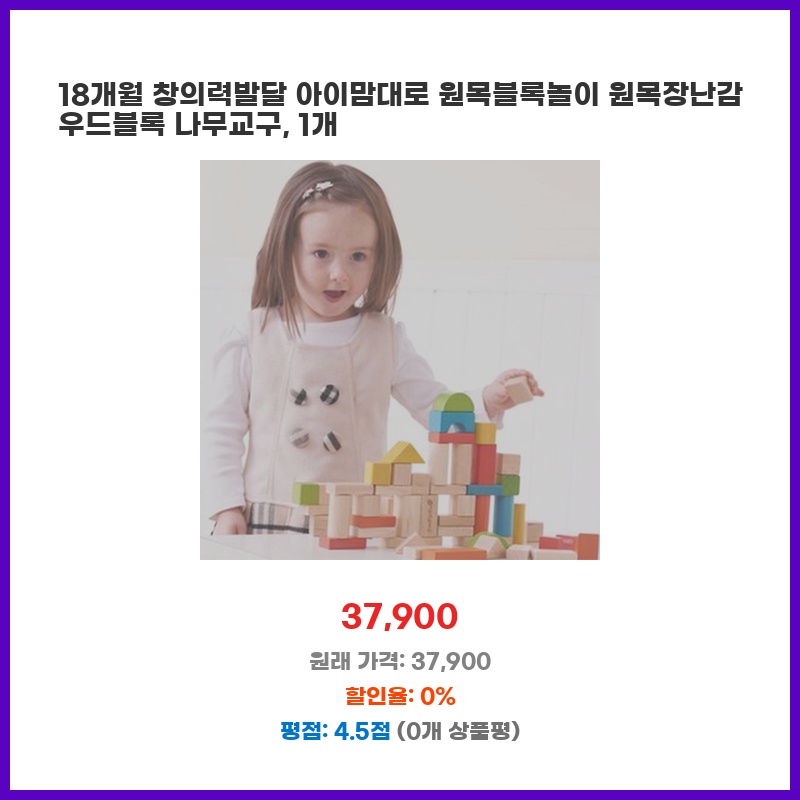 아이의 창의력 발달을 위해 원목 블록을 찾던 중, 18개월 아기에게 적합한 크기와 안전한 원목 소재에 끌렸습니다. 다양한 모양의 블록으로 여러 가지 놀이가 가능하고, 내구성도 좋아 오래 사용할 수 있을 것 같아 구매했습니다.