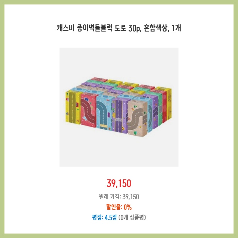 아이들과 함께 놀이 공간을 만들어주고 싶어서 구매했습니다. 종이로 만들어져 가볍고 안전하며, 다양한 색상으로 창의적인 놀이가 가능할 것 같아 선택했습니다. 30개의 블록이면 꽤 넓은 공간을 만들 수 있을 것 같습니다.