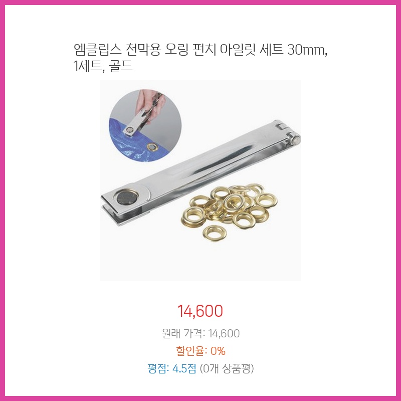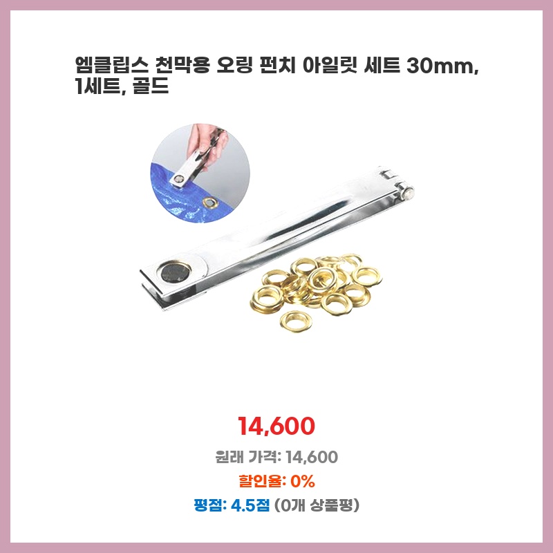 천막 제작에 필요한 오링과 펀치가 세트로 구성되어 편리하게 구매할 수 있었습니다. 30mm 사이즈는 제가 원하는 크기였고, 골드 색상도 고급스러워 만족스럽습니다. 튼튼한 펀치로 작업 효율도 높아졌습니다.