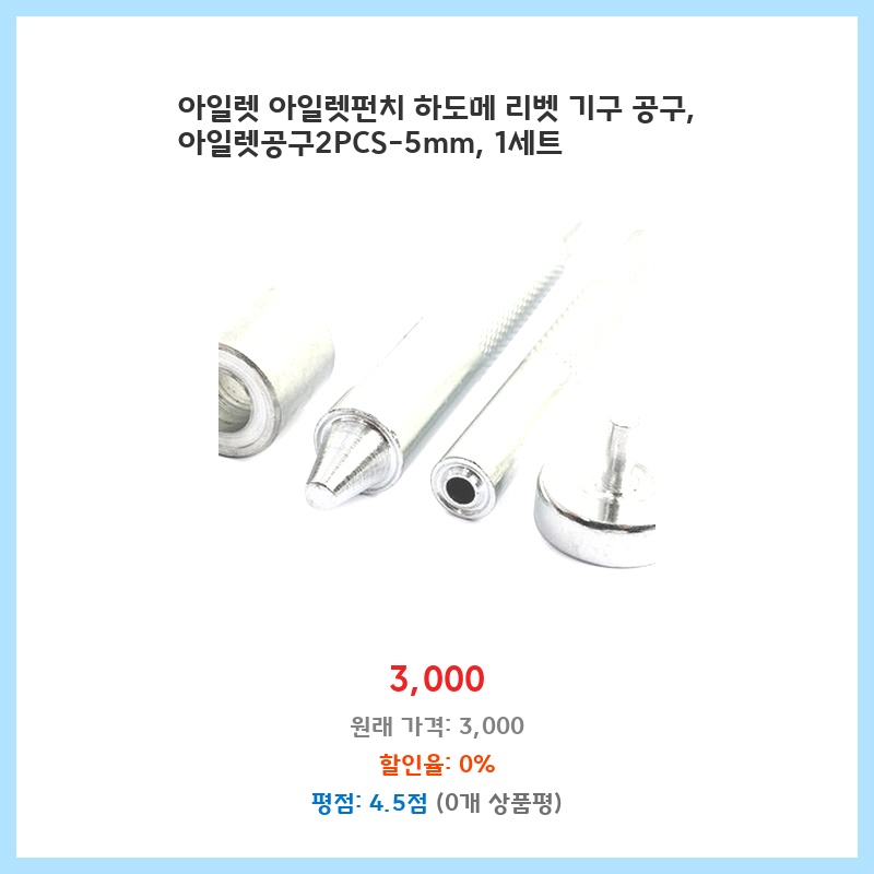 가죽공예를 시작하면서 아일렛 작업이 필요했는데, 저렴한 가격에 5mm 사이즈까지 작업 가능한 펀치 세트를 찾았습니다. 휴대성도 좋고, 생각보다 튼튼해서 만족스럽습니다. 작은 크기의 아일렛 작업에 적합해 보입니다.