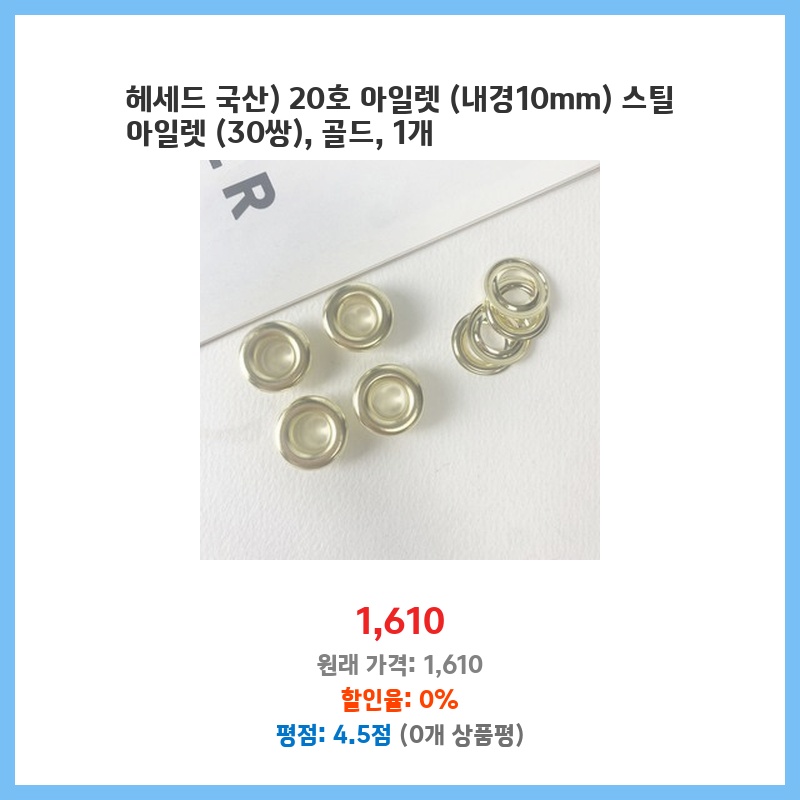 가죽공예를 취미로 하는데, 국산 제품이라 믿음직하고 품질이 좋아 보여 구매했습니다. 10mm 내경이라 제가 사용하는 가죽에 딱 맞는 사이즈였고, 골드 색상도 고급스러워 만족스러워요. 30쌍이라 넉넉하게 사용할 수 있는 점도 좋습니다.