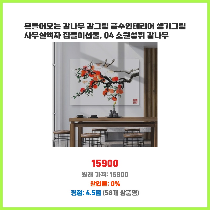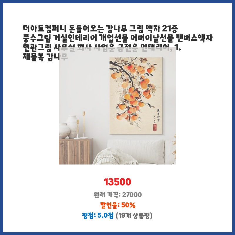 지금 뜨는 상품 더아트컴퍼니 돈들어오는 감나무 그림 액자 21종 풍수그림 거실인테리어 개업선물 어버이날선물 캔버스액자 현관그림 사무실 회사 사업운... 서두르세요