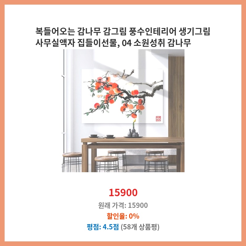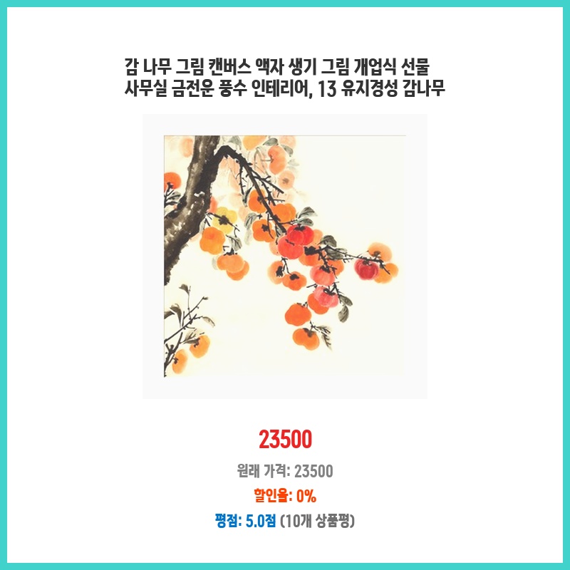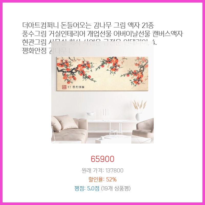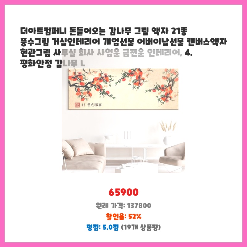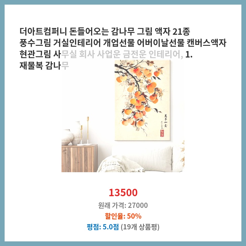 거실 인테리어 소품으로 감나무 그림을 찾던 중 가격이 저렴하면서 21종이나 되는 다양한 디자인 중 선택할 수 있어 구매했습니다. 캔버스 액자라 깔끔하고, 풍수적으로도 좋다는 점이 마음에 들었습니다.