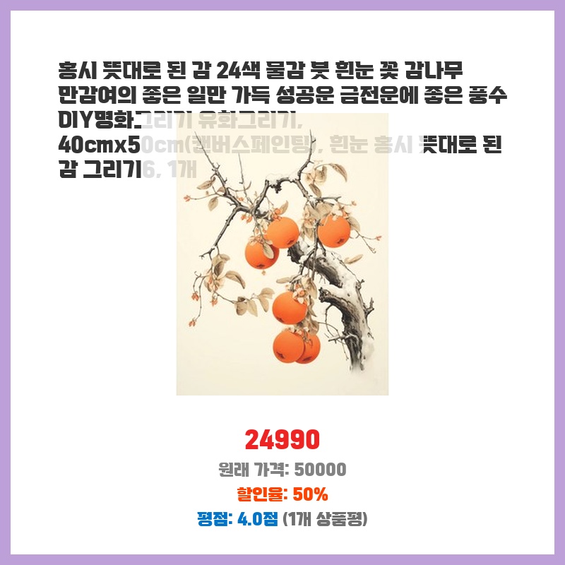 홍시 뜻대로 된 감 24색 물감 붓 흰눈 꽃 감나무 만감여의 좋은 일만 가득 성공운 금전운에 좋은 풍수 DIY명화그리기 유화그리기, 40cmx50cm(캔버스페인팅), 흰눈 홍시 뜻대로 된 감 그리기6, 1개