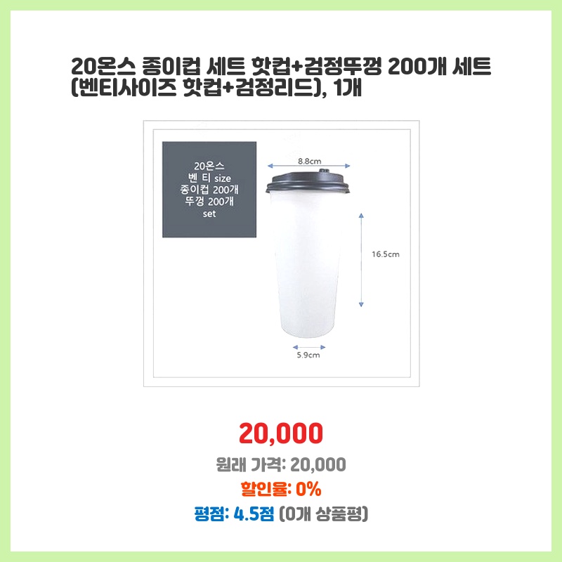 벤티 사이즈라 용량이 커서 좋고, 200개 세트라 한 번에 많이 구매해서 편리합니다. 검정 뚜껑도 있어서 깔끔하게 사용할 수 있을 것 같아 구매했습니다. 종이컵이라 쓰레기 처리도 간편합니다.