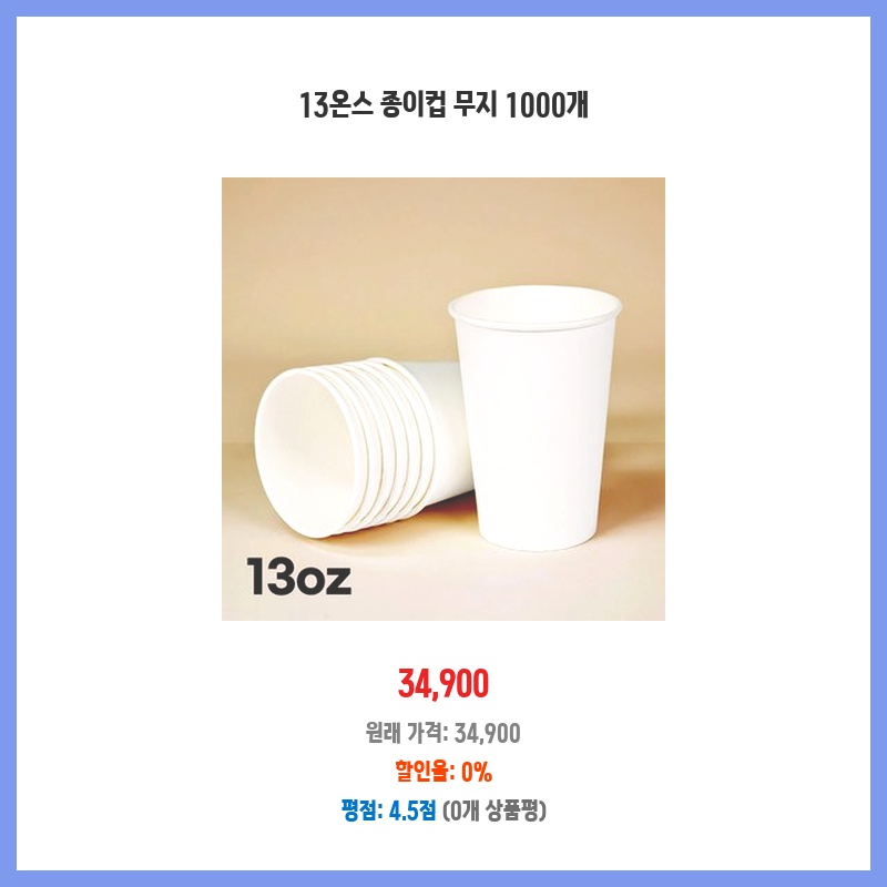 행사 때 사용했는데, 생각보다 튼튼하고 양도 많아서 좋았어요. 13온스라 음료도 충분히 담을 수 있었고, 무지라 디자인 걱정 없이 사용했습니다.