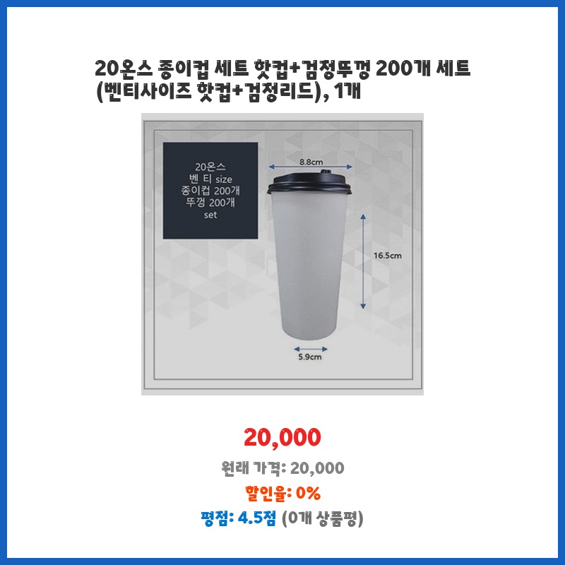 20온스 종이컵 세트 핫컵+검정뚜껑 200개 세트 (벤티사이즈 핫컵+검정리드), 1개