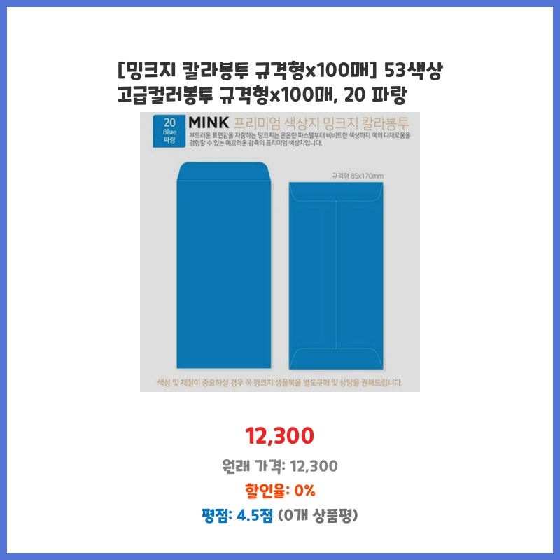 [밍크지 칼라봉투 규격형x100매] 53색상 고급컬러봉투 규격형x100매, 20 파랑