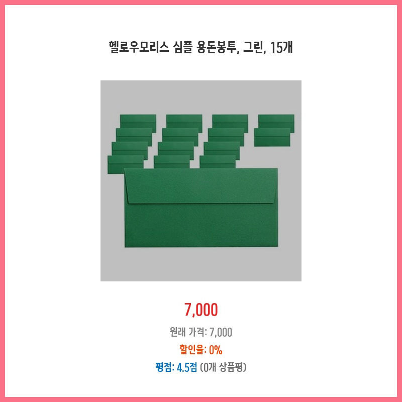 심플한 디자인과 넉넉한 15개 수량이 마음에 들어 구매했습니다. 용돈 주기에 적합한 크기와 깔끔한 그린 색상이 좋았습니다. 종이 재질도 괜찮아서 만족스러워요.