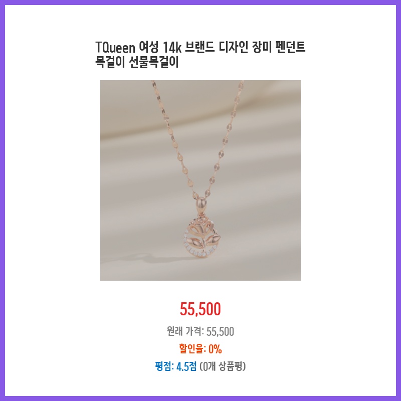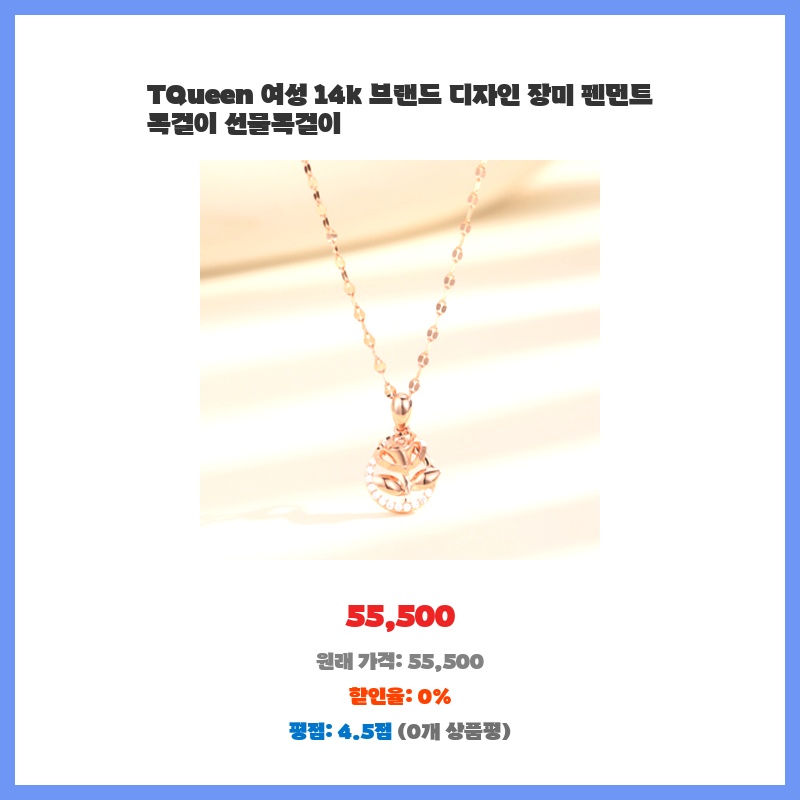깔끔한 디자인과 14k 소재의 고급스러움에 반해 구매했습니다. 장미 펜던트가 여성스러우면서 데일리로 착용하기 좋고, 선물용으로도 적합해 보였습니다. 실제 제품도 사진과 거의 동일했습니다.