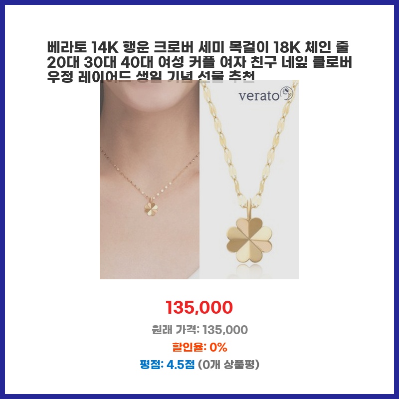 초특가 베라토 14K 행운 크로버 세미 목걸이 18K 체인 줄 20대 30대 40대 여성 커플 여자 친구 네잎 클로버 우정 레이어드 생일 기... 지금만 할인 중