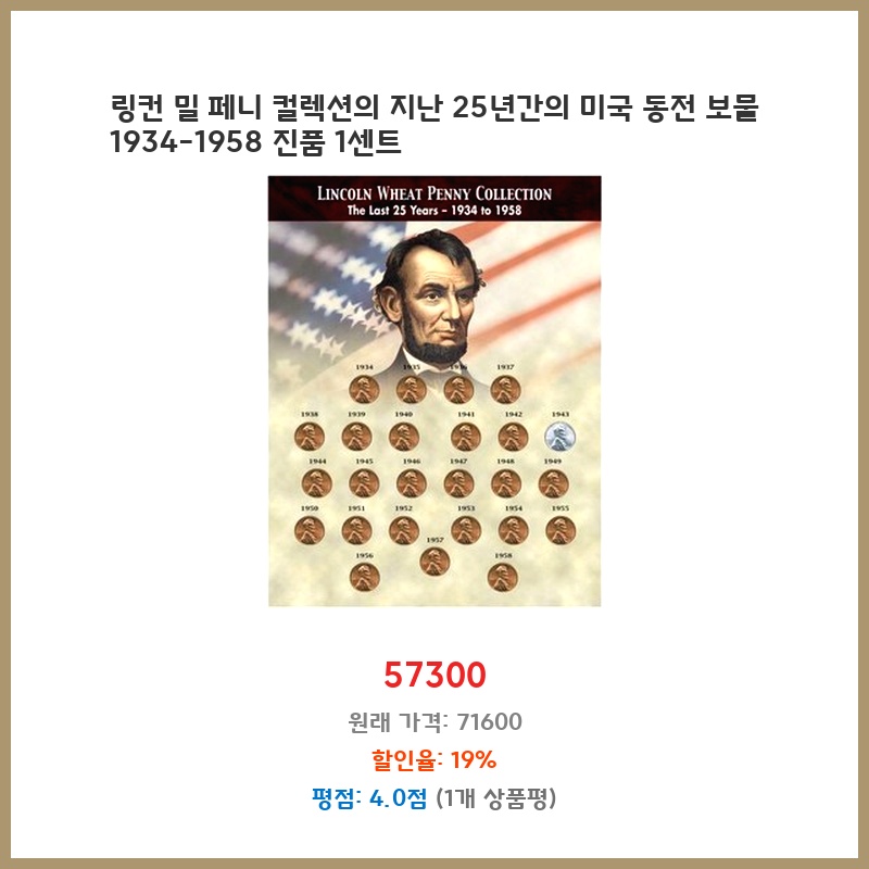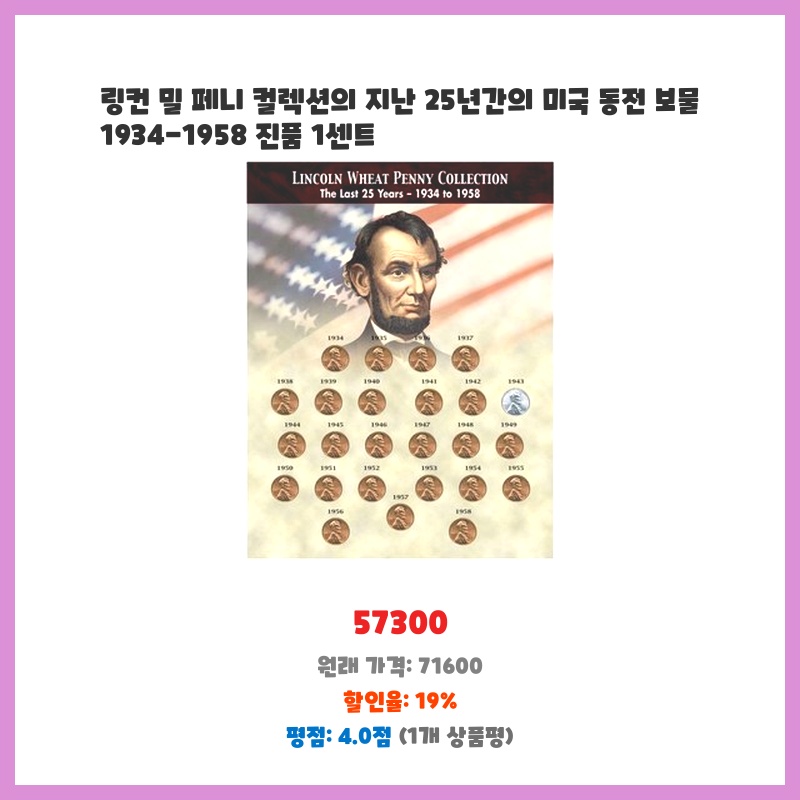 링컨 밀 페니 컬렉션은 미국 역사의 한 부분을 소장할 수 있는 의미있는 아이템입니다. 1934년부터 1958년까지의 진품 동전이라는 점과 희소성 때문에 투자 가치도 고려했습니다. 상태가 좋은 동전들을 한꺼번에 소장할 수 있다는 점이 매력적이었습니다.