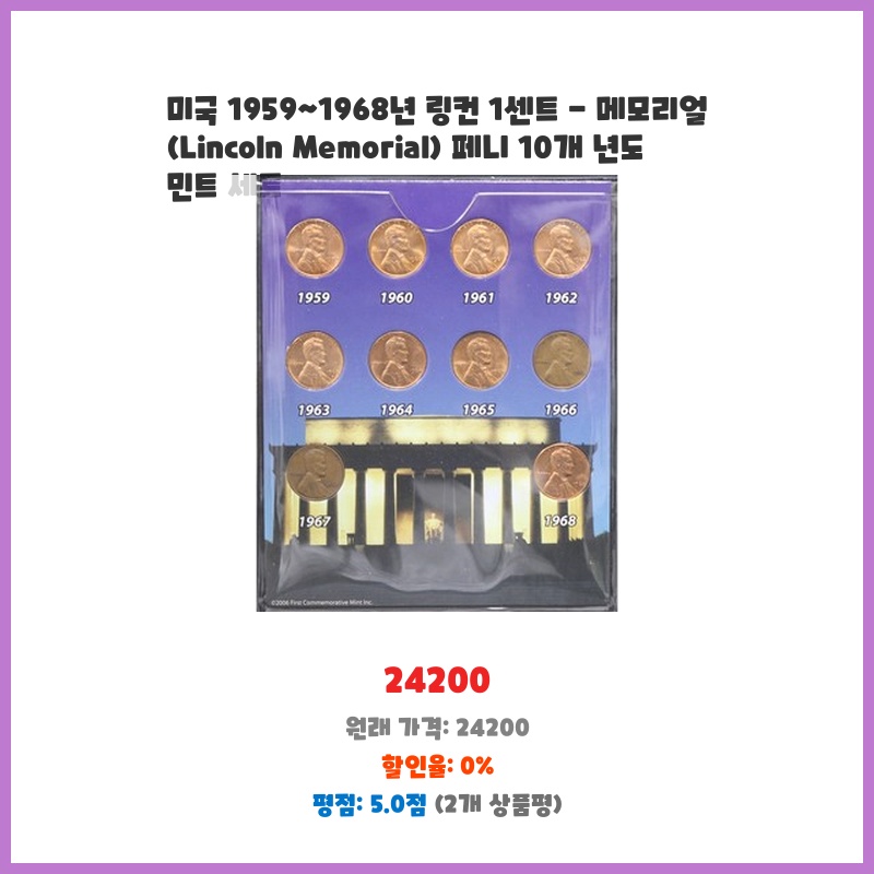 1959년부터 1968년까지의 링컨 센트를 한 번에 소장할 수 있어 미국 역사와 화폐 수집에 대한 관심을 충족시켜 줍니다. 각 년도의 민트 마크를 확인하며 수집의 재미를 느낄 수 있고, 상태가 좋은 코인들을 합리적인 가격에 구매할 수 있다는 점이 매력적입니다.