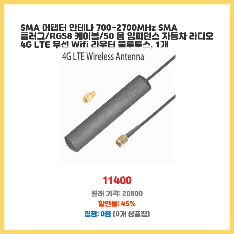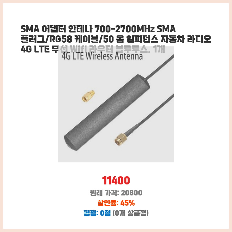차량용 4G LTE 무선 라우터에 기존 안테나보다 수신 감도를 높이고 싶어서 구매했습니다. 700-2700MHz의 넓은 주파수 대역을 지원하고 SMA 커넥터 방식이라 호환성이 좋아 편리할 것 같았습니다. RG58 케이블도 튼튼해 보였습니다.