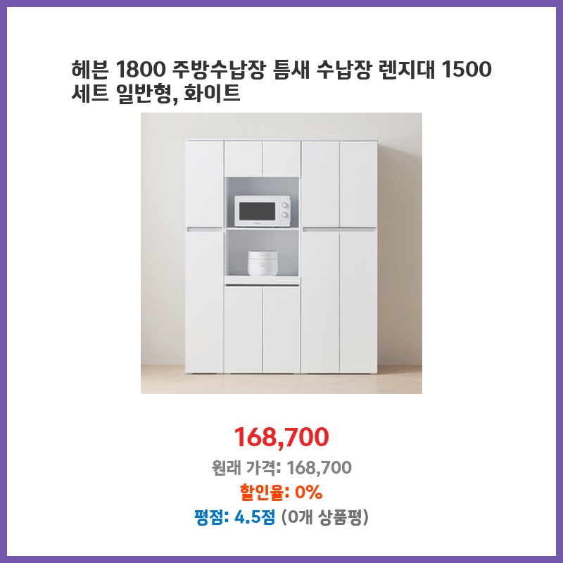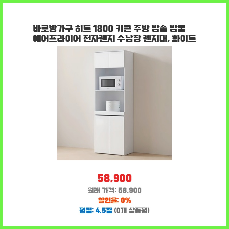 렌지대와 틈새수납장 모두 넉넉해서 정말 만족합니다! 깔끔한 화이트 색상도 마음에 들고, 생각보다 튼튼해서 오래 쓸 것 같아요.