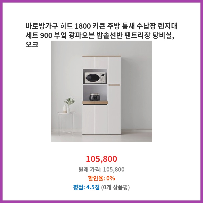 카테고리 1위 바로방가구 히트 1800 키큰 주방 틈새 수납장 렌지대 세트 900 부엌 광파오븐 밥솥선반 팬트리장 탕비실 오크 일상에 꼭 필요한 상품