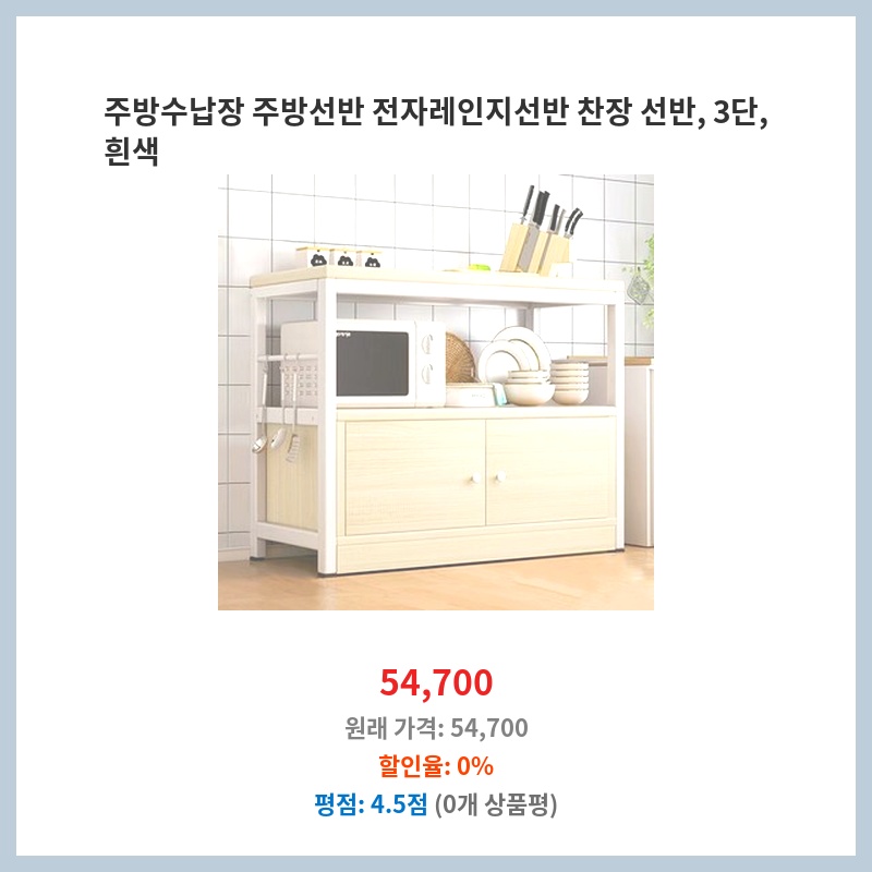 좁은 주방에 수납공간이 부족하여 3단 선반을 찾던 중 가격 대비 넉넉한 크기와 깔끔한 흰색 디자인에 마음에 들었습니다. 전자레인지도 올려놓을 수 있어 공간 활용도가 높아 보였습니다. 조립도 어렵지 않아서 좋았습니다.