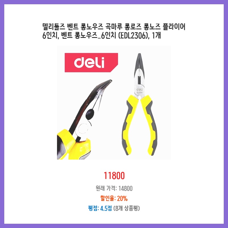좁은 공간에서의 작업이 많아 벤트 기능이 있는 롱노즈 플라이어가 필요했습니다. 6인치는 적당한 길이로 작업성이 좋을 것 같아 구매했습니다. 델리툴즈 제품이라 품질도 신뢰할 수 있을 것 같았습니다.