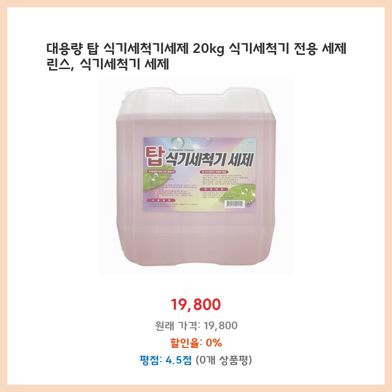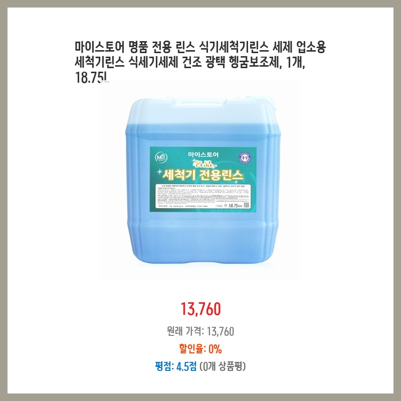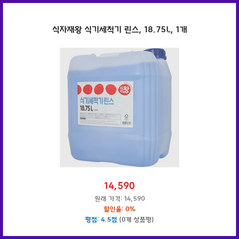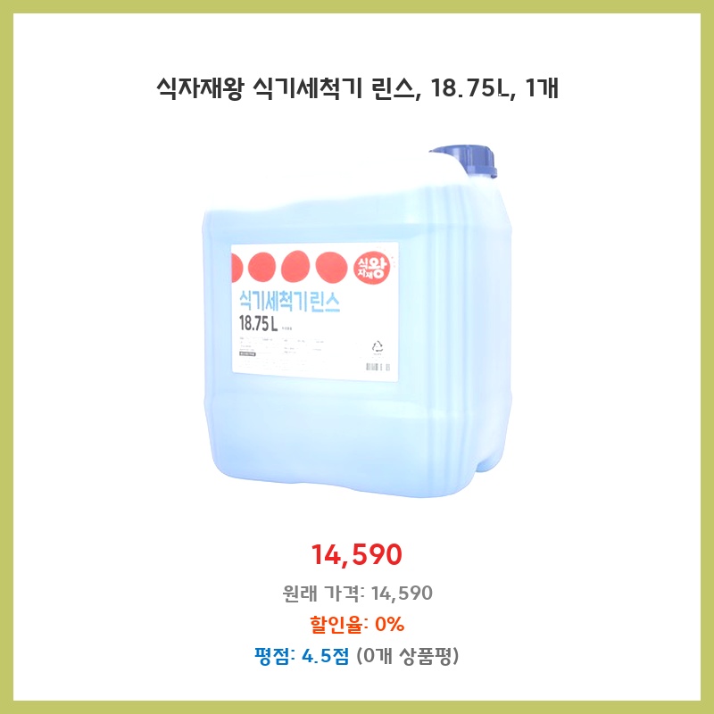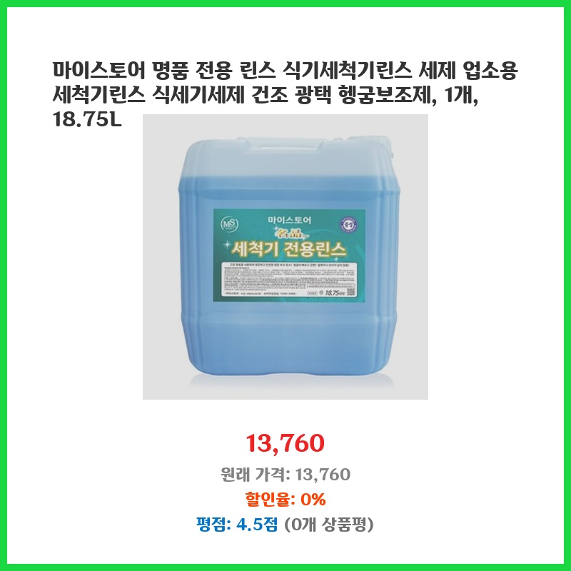 업소용 식기세척기린스를 찾던 중 대용량에 가격도 합리적인 제품을 발견했습니다. 18.75L 대용량이라 자주 구매할 필요 없고, 헹굼보조제 기능까지 있어서 식기의 광택과 건조에도 효과적일 것 같아 구매했습니다. 명품 전용이라는 점도 마음에 들었습니다.