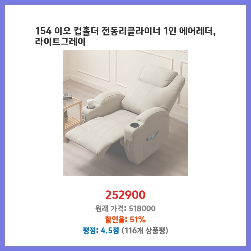 앉았을 때 편안함이 정말 좋습니다. 컵홀더도 유용하고, 리클라이너 기능 덕분에 낮잠도 잘 수 있어요! 가격 대비 만족도가 높습니다.