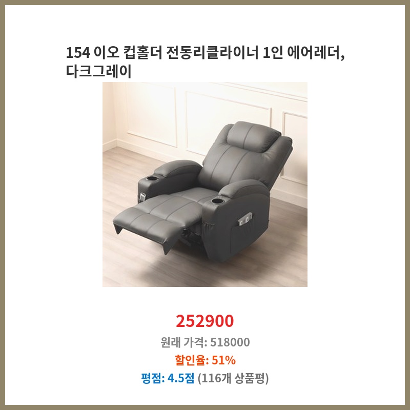 편안하게 휴식을 취할 수 있어 만족합니다. 리클라이닝 기능이 부드럽고, 컵홀더도 실제로 자주 사용하게 되네요. 색상도 사진과 같이 고급스럽습니다.