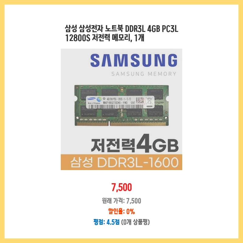 기존 노트북 메모리 용량 부족으로 웹서핑 및 문서작업 속도 개선을 위해 구매했습니다. 저렴한 가격에 DDR3L 규격을 지원하는 제품이라 부담없이 업그레이드할 수 있었습니다. 4GB 용량으로 가볍게 사용하기에 충분합니다.