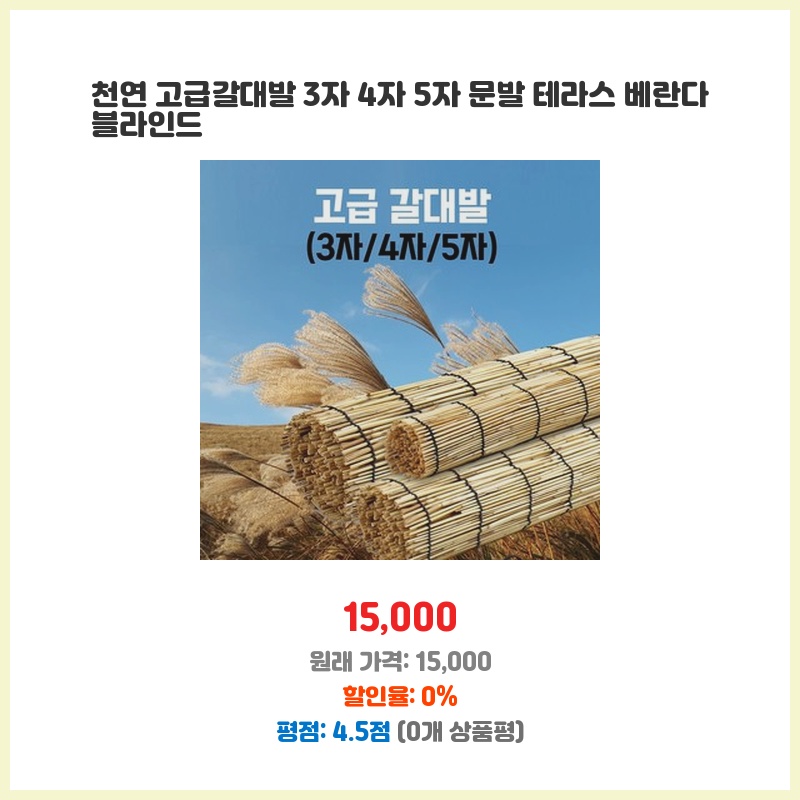 베란다에 햇빛 차단과 시원한 바람을 위해 갈대발을 찾았습니다. 천연 소재라 친환경적이고, 깔끔한 디자인이 마음에 들었습니다. 가격도 저렴해서 부담 없이 구매했습니다. 3자, 4자, 5자 사이즈 선택도 가능해서 좋았습니다.