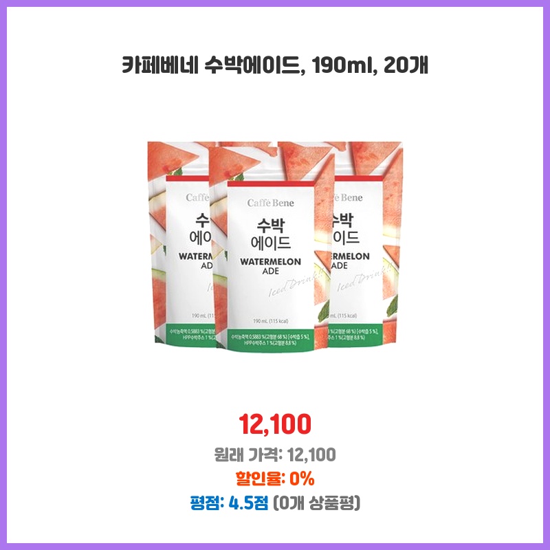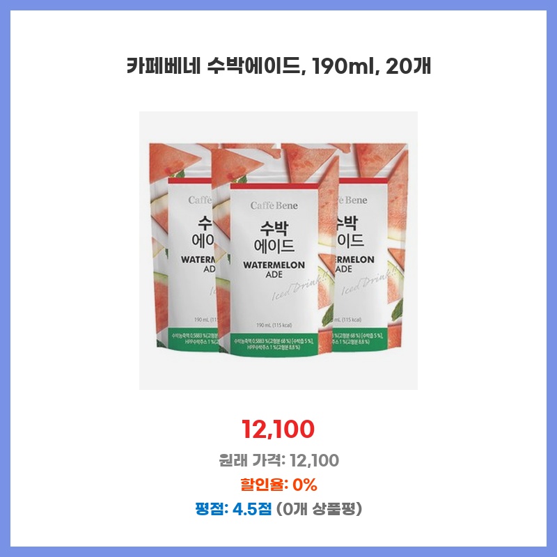 더운 날씨에 시원한 음료가 필요해서 카페베네 수박에이드를 선택했습니다. 190ml 용량에 20개입이라 가족이나 친구들과 함께 나눠 마시기에 적절하고, 카페베네 브랜드에 대한 신뢰도가 높아 구매했습니다. 휴대성도 좋아 외출 시에도 편리하게 즐길 수 있습니다.
