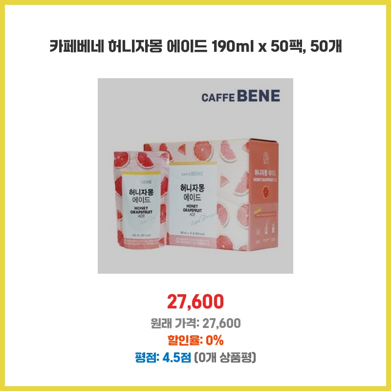 카페베네 허니자몽 에이드를 좋아해서 대용량으로 구매했습니다. 190ml 개별 포장이라 휴대성이 좋고, 사무실이나 야외에서 간편하게 즐기기 좋을 것 같아서 선택했습니다. 50팩이면 한동안 넉넉하게 마실 수 있겠네요.