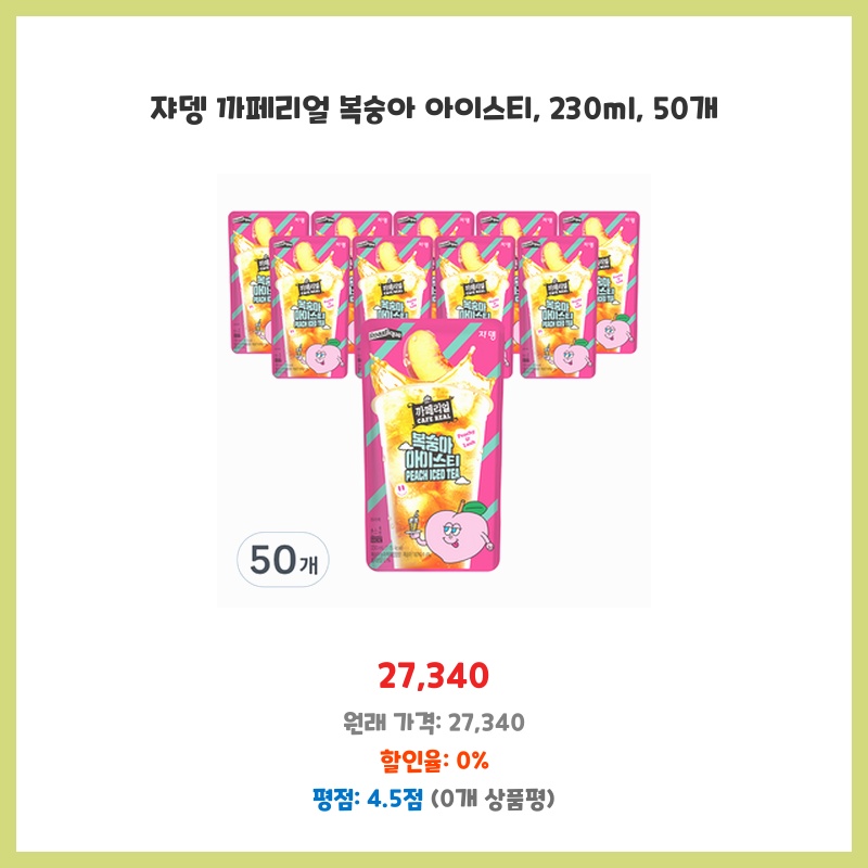 사무실에서 시원한 음료가 필요했고, 까페리얼 복숭아 아이스티는 맛이 부드럽고 깔끔해서 직원들이 좋아합니다. 230ml 용량에 50개들이라 개별 포장으로 위생적이며, 오랫동안 보관하기에도 편리합니다. 가격 대비 양도 만족스럽습니다.