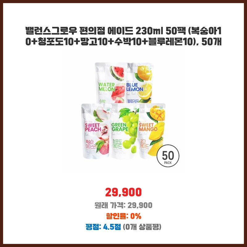 밸런스그로우 편의점 에이드 230ml 50팩 (복숭아10+청포도10+망고10+수박10+블루레몬10), 50개
