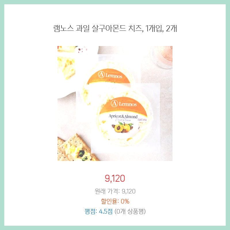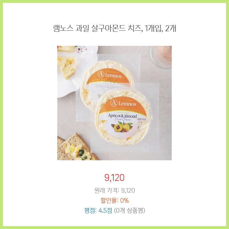 램노스 과일 살구아몬드 치즈의 부드러운 크림치즈와 달콤한 살구, 고소한 아몬드의 조화가 궁금해서 구매했습니다. 후기가 좋아 믿고 구입했고, 1개입과 2개입 선택이 가능해서 좋았습니다. 간식으로 먹기에 적당한 크기와 가격도 만족스러웠습니다.