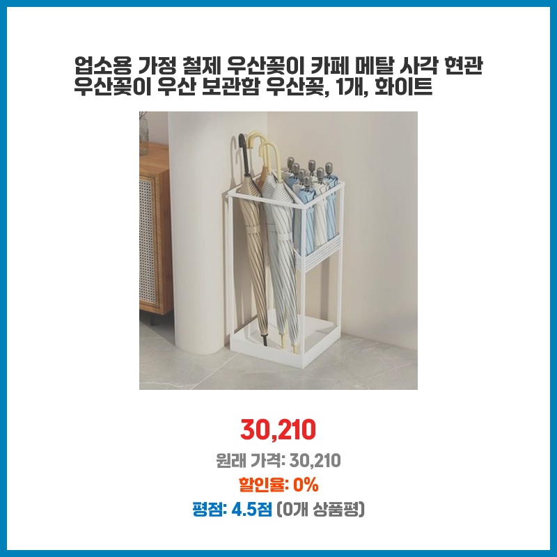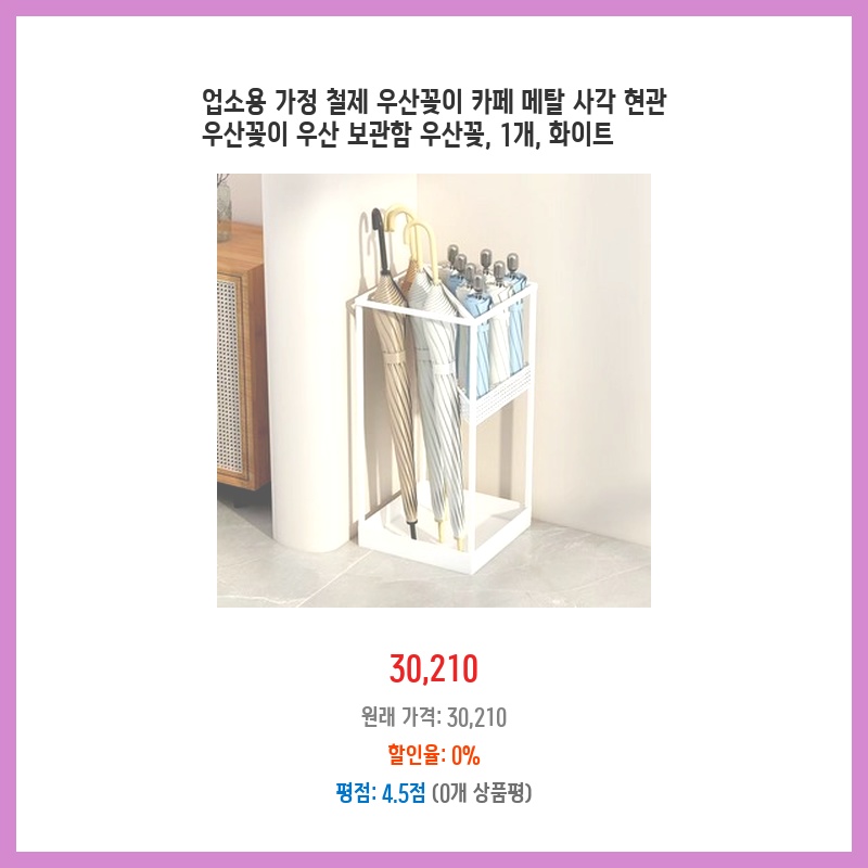 깔끔한 화이트 색상과 사각 디자인이 카페 인테리어와 잘 어울릴 것 같아 구매했습니다. 철제 소재라 튼튼하고, 우산을 여러 개 보관할 수 있는 적절한 크기라 실용적일 것으로 예상됩니다. 다른 우산꽂이보다 디자인이 훨씬 낫네요.