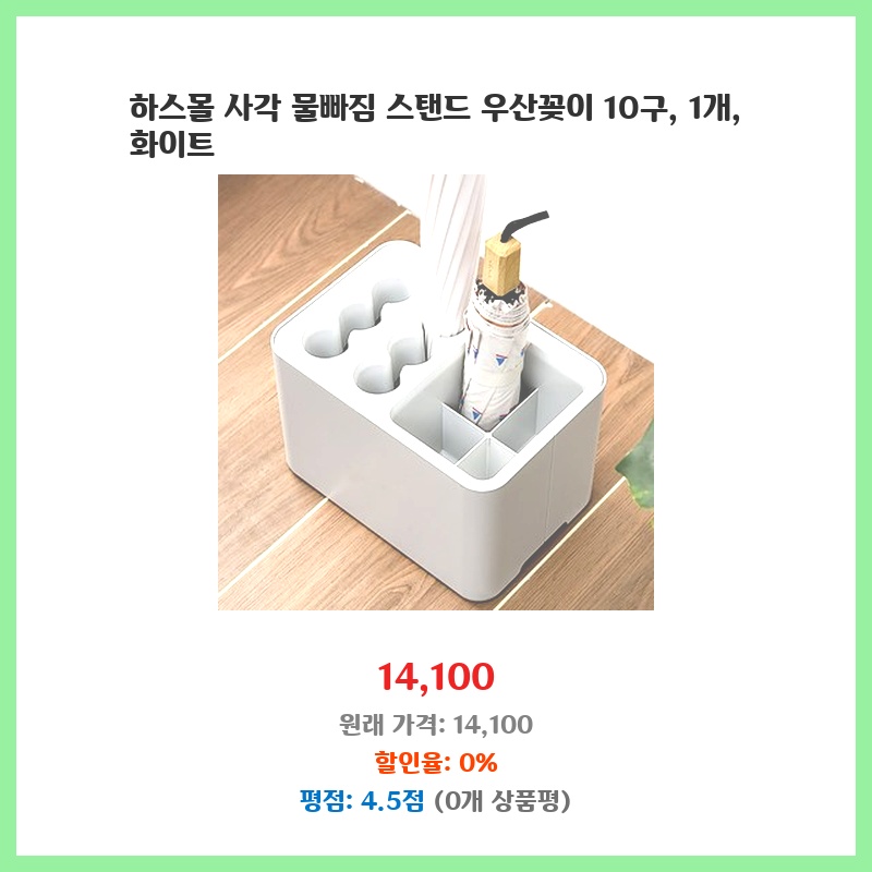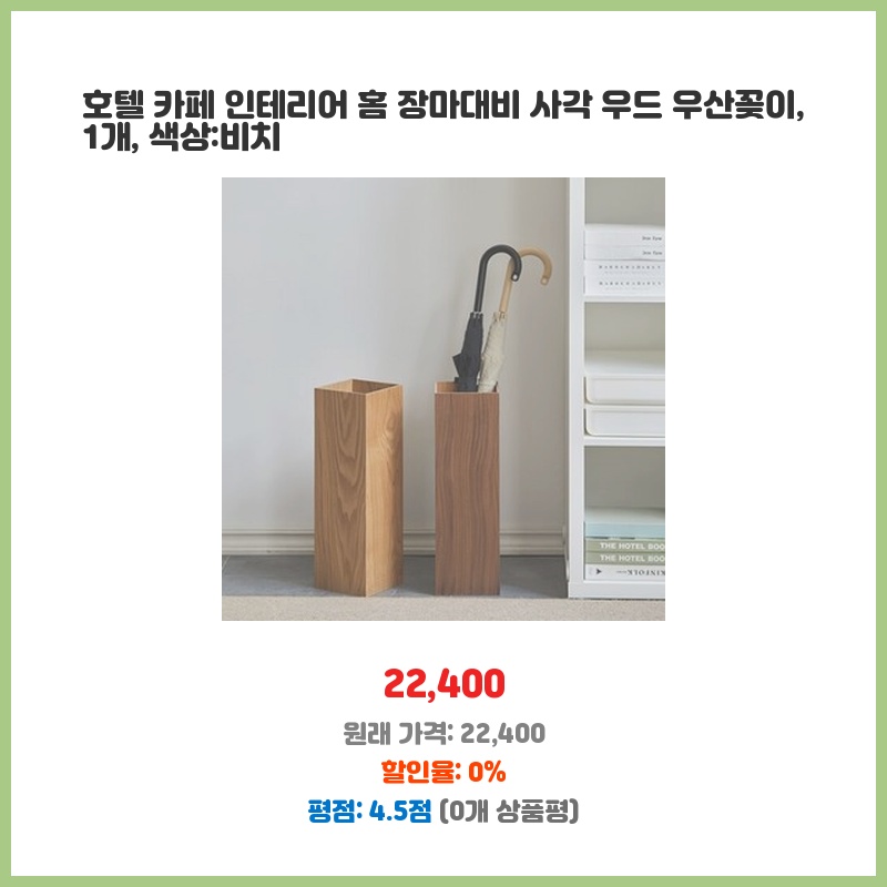 호텔 카페 분위기의 우산꽂이를 찾던 중 디자인과 실용성을 모두 갖춘 제품을 발견했습니다. 깔끔한 비치 색상과 사각 디자인이 마음에 들었고, 우드 소재라 고급스러워 보입니다. 장마철 빗물 관리에도 효과적일 것 같아 구매했습니다.