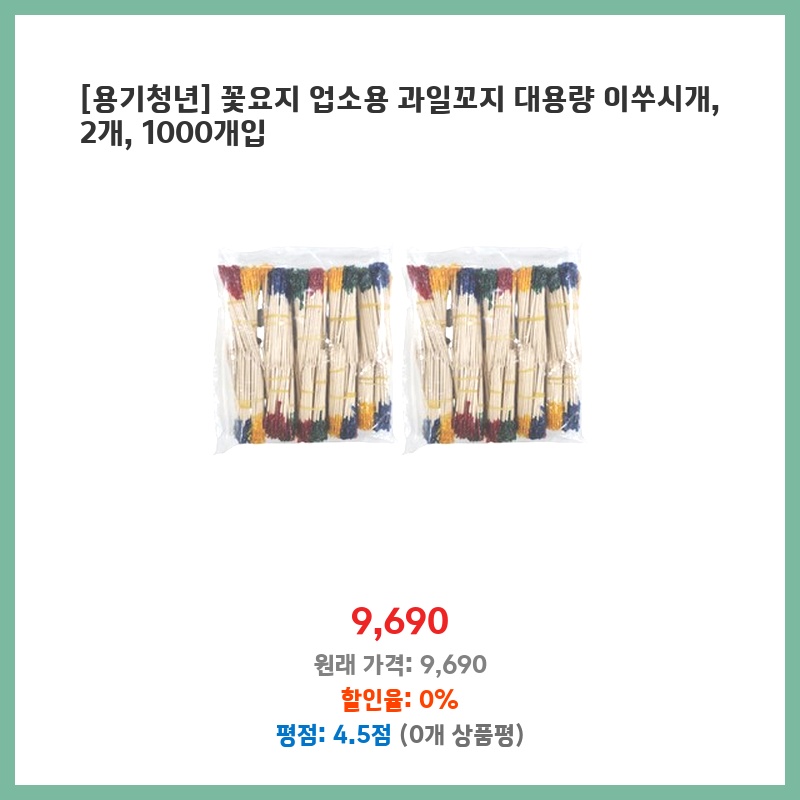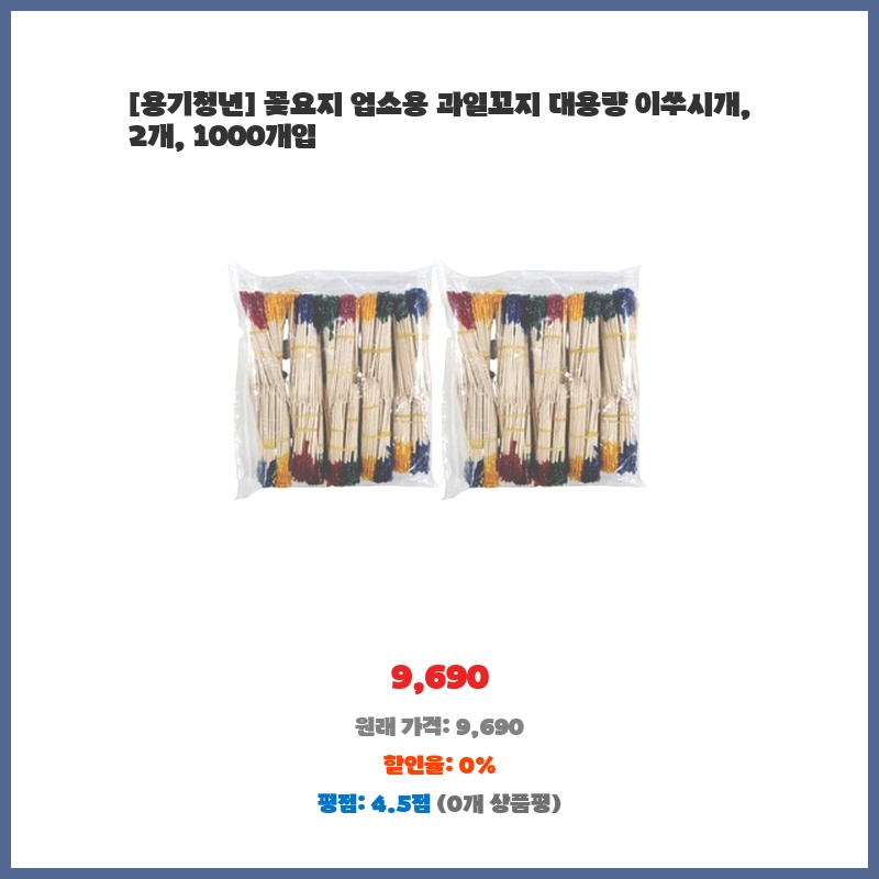 업소용으로 과일꼬지를 많이 사용하는데, 1000개 대용량에 가격도 저렴해서 경제적입니다. 개별 포장이 아니라서 보관 공간도 효율적이고, 튼튼한 이쑤시개라 꼬지가 잘 부러지지 않아 좋습니다. 두 개 세트라 더욱 오래 사용할 수 있을 것 같아요.
