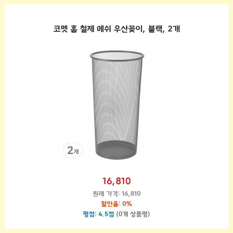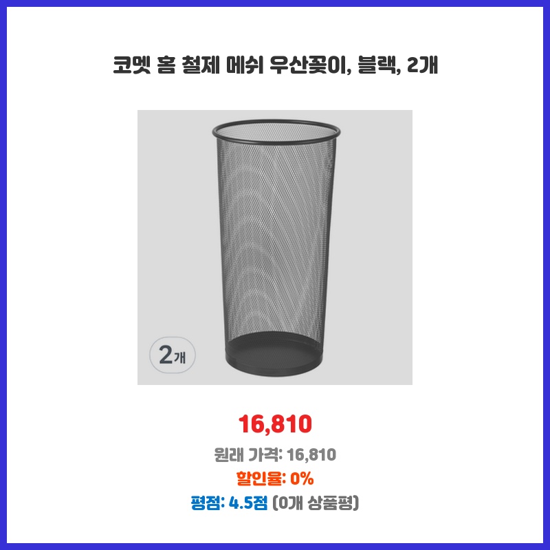 현관이 좁아 우산 정리가 어려웠는데, 깔끔한 디자인에 2개 세트라 공간 활용도가 높아 구매했습니다. 철제라 튼튼하고, 메쉬 소재라 통풍도 잘 될 것 같아 선택했습니다. 블랙 색상도 인테리어에 잘 어울립니다.