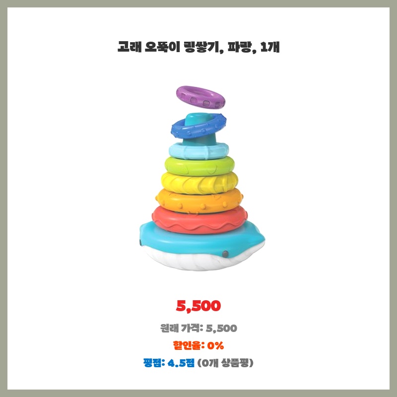 아이가 고래를 좋아해서 구매했습니다. 오뚝이와 링 쌓기가 결합된 독특한 디자인이 마음에 들었고, 색상도 예쁩니다. 안전한 소재로 만들어져 안심하고 아이에게 줄 수 있을 것 같아요. 크기도 적당해서 보관도 용이할 것 같습니다.