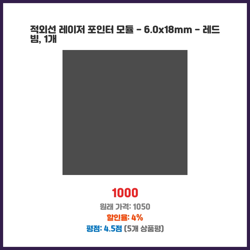 소형 프로젝트에 적합한 크기와 저렴한 가격이 매력적이었습니다. 6.0x18mm의 작은 사이즈 덕분에 공간 제약 없이 활용할 수 있을 것 같아 구매했습니다. 레드 빔이 선명하게 보인다는 점도 장점입니다.