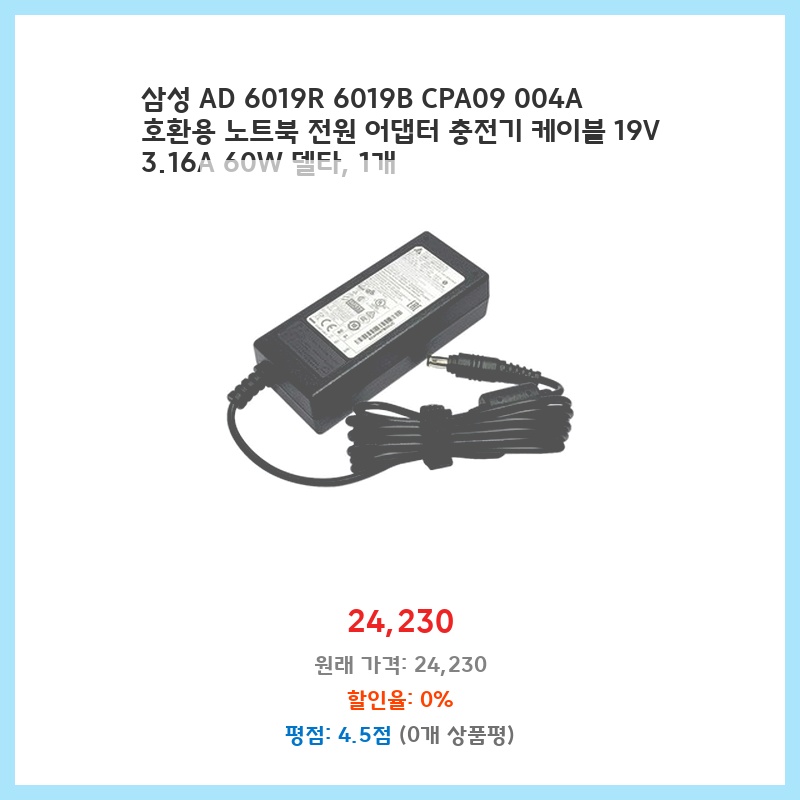 한정 수량 삼성 AD 6019R 6019B CPA09 004A 호환용 노트북 전원 어댑터 충전기 케이블 19V 3.16A 60W 델타 1개 클릭 한 번으로 구매