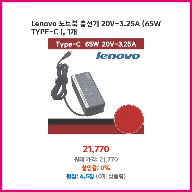 기존 노트북 충전기가 고장나서 교체용으로 구매했습니다. Lenovo 정품이라 호환성이 좋고, 65W로 충분한 출력을 제공하여 빠른 충전이 가능합니다. TYPE-C 단자라 휴대성도 좋습니다.