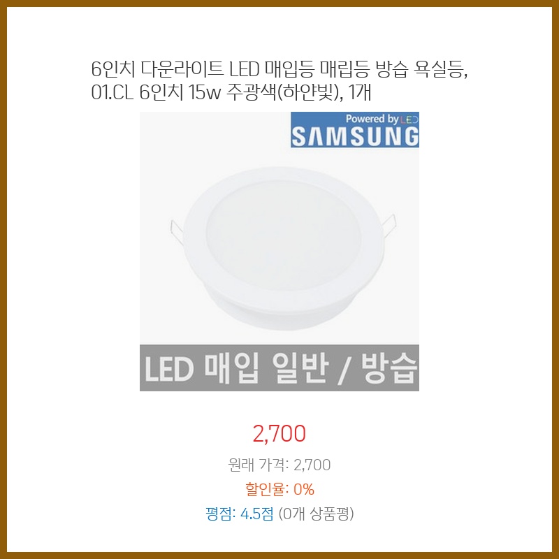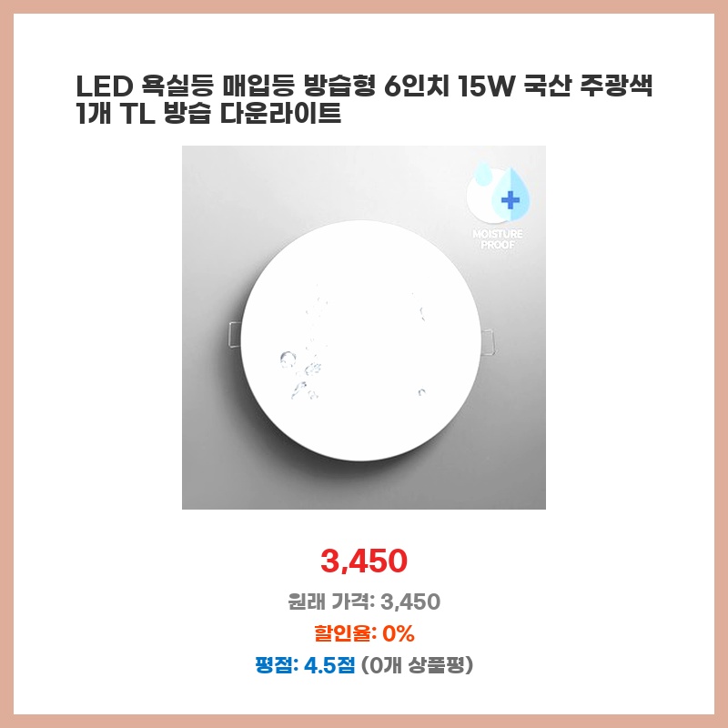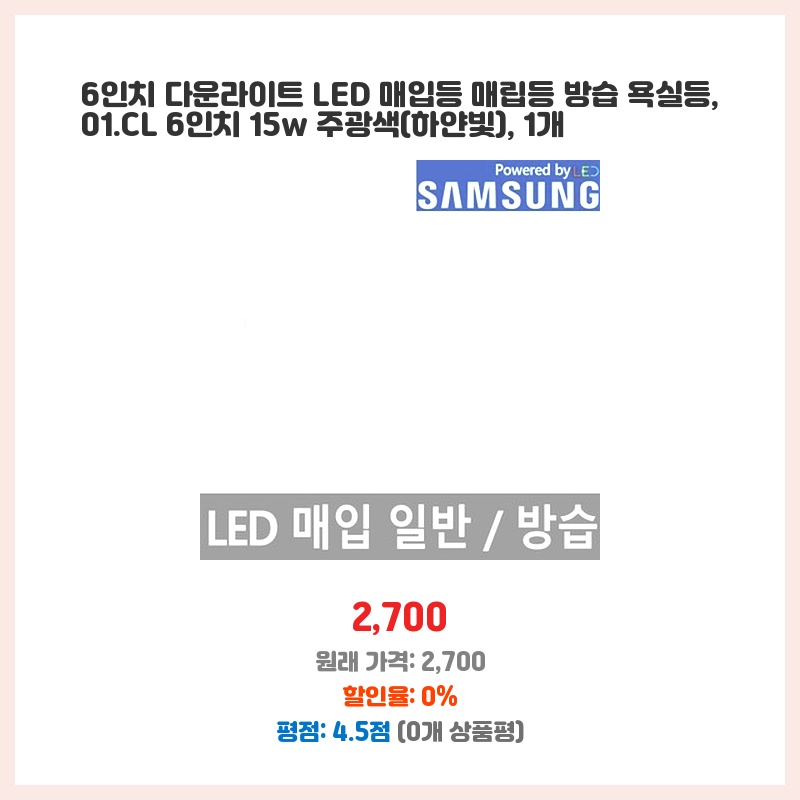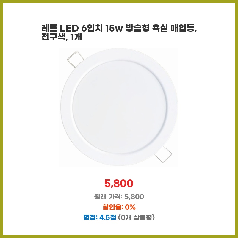 욕실 조명 교체가 필요했는데, 방습 기능이 있는 6인치 LED 매입등이 가격 대비 성능이 좋아 보였습니다. 밝기(15W)도 적당하고, 심플한 디자인이 마음에 들었습니다. 설치도 어렵지 않아 직접 교체할 수 있었습니다.