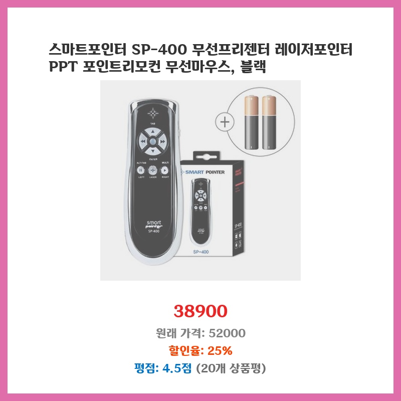 PPT 발표가 잦은 직업 특성상 편리한 프리젠터가 필요했습니다. SP-400은 무선 연결이 안정적이고, 레이저 포인터 기능도 정확해서 발표에 집중할 수 있었습니다. 무선 마우스 기능도 추가되어 편의성이 높았습니다.
