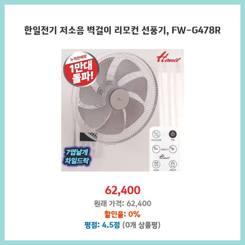 한일전기 저소음 벽걸이 리모컨 선풍기, FW-G478R